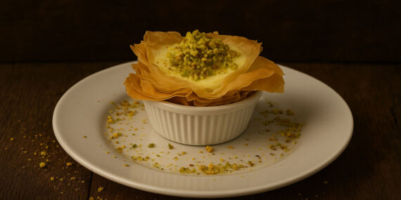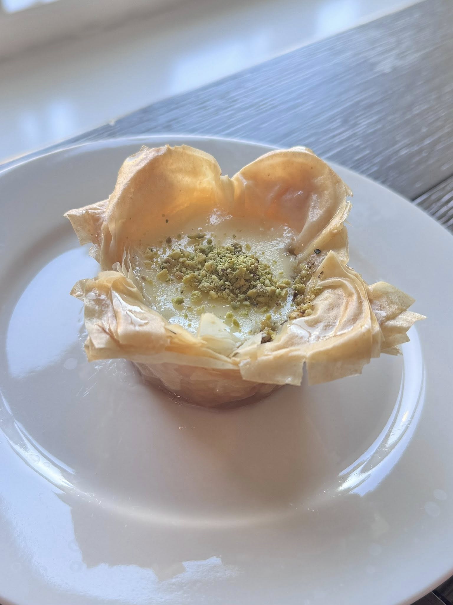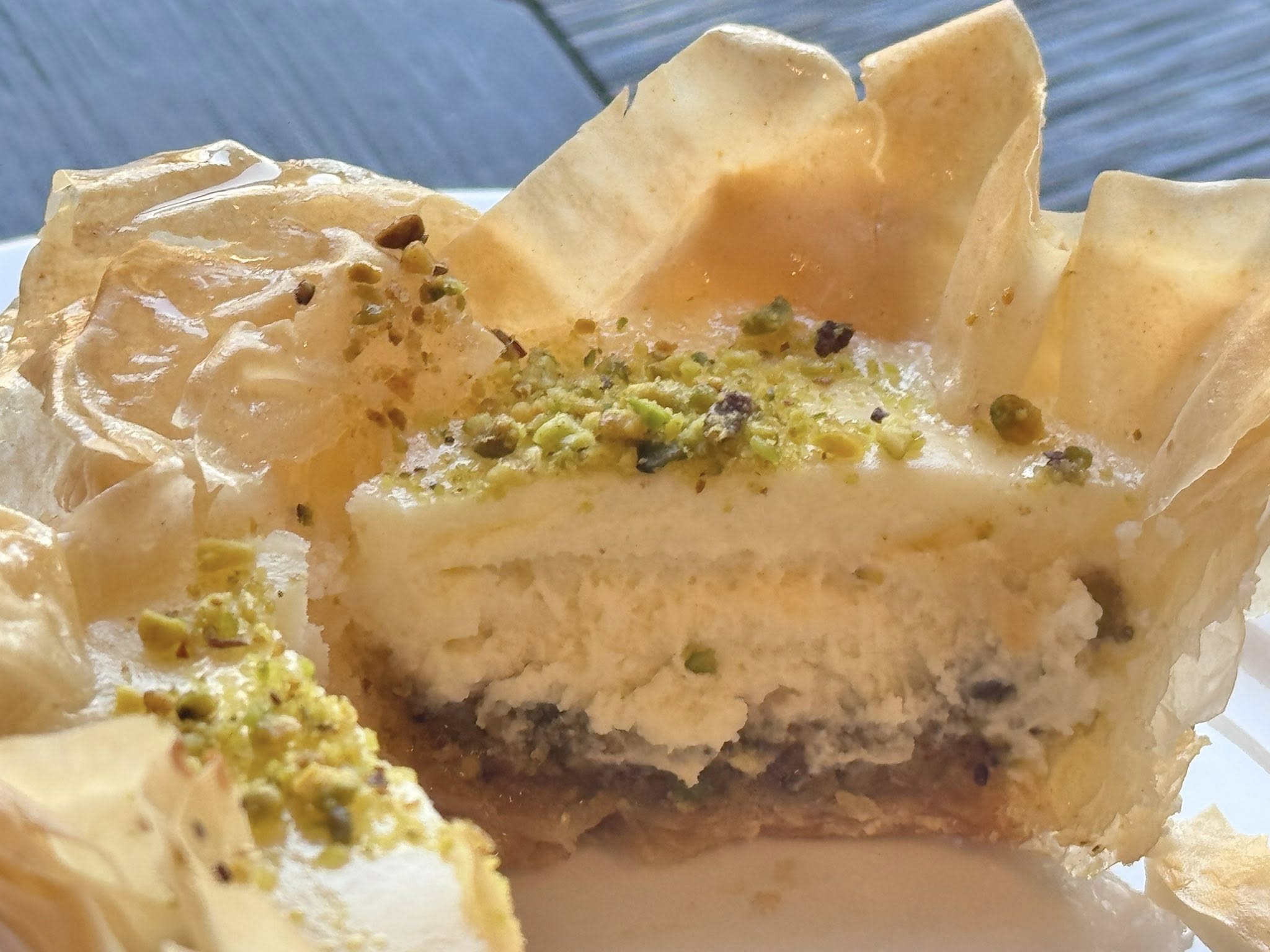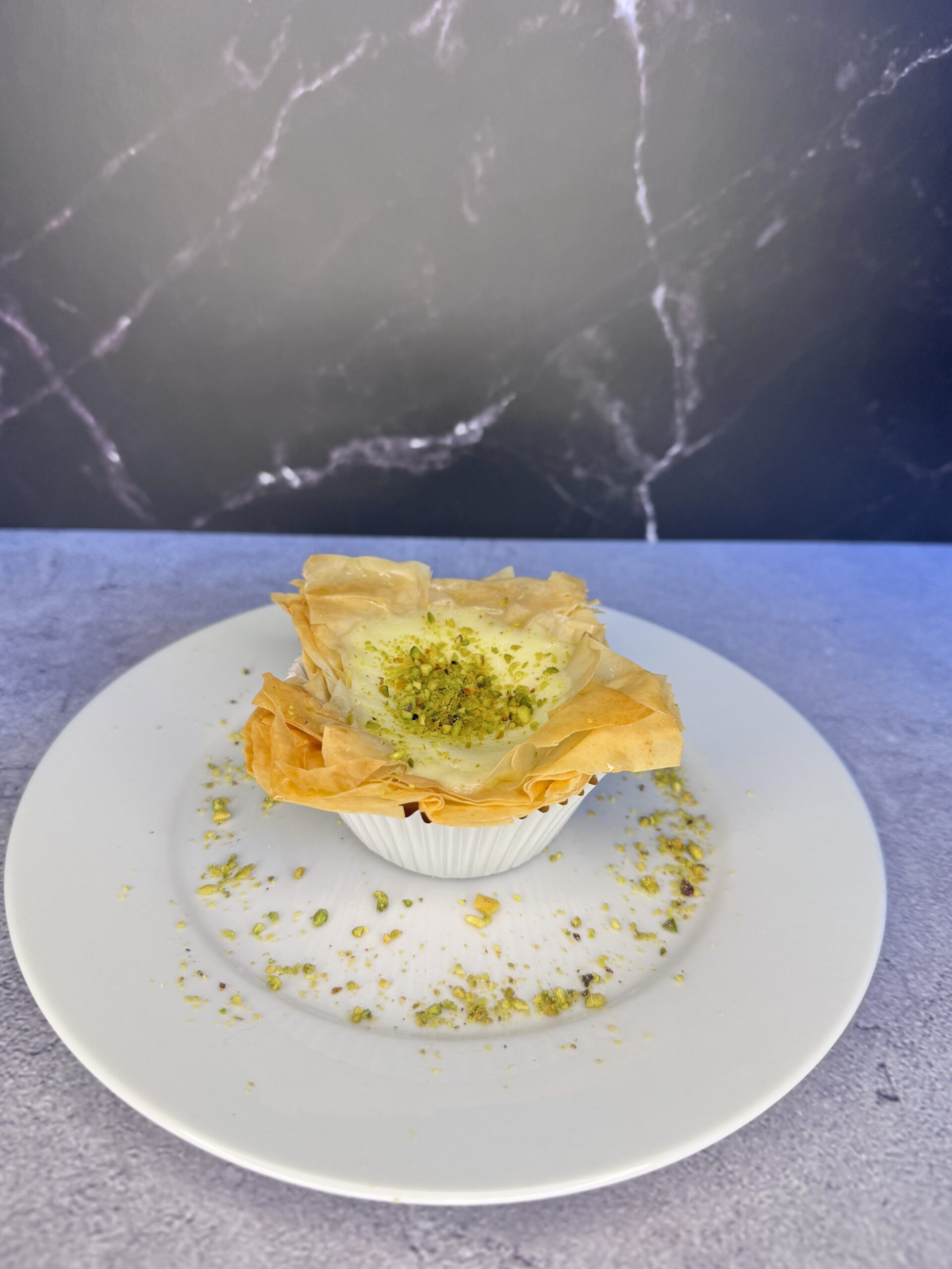 Our newest obsession — where cheesecake meets baklava in one irresistible dessert. Each cup begins with layers of delicate phyllo dough, brushed with rich butter between every sheet. The base features our signature pistachio nut blend, followed by a thick layer of smooth, creamy cheesecake. It’s then finished with a sprinkle of pistachios and a drizzle of our signature rose water syrup. Designed in individual cups so that every bite delivers the perfect harmony of crisp, creamy, and sweet—a true fusion of two beloved classics.